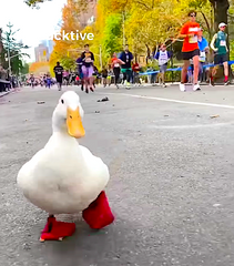 Wrinkle, an emotional support Pekin duck, was a runaway hit when she joined her owner to race in this year’s NYC Marathon. Wrinkle ran in the race along with her human counterparts sporting homemade red shoes to protect her feet from the rough parts of the city streets. Wrinkle may not have won the Marathon, but she became an instant sensation with the crowd cheering her on as she waddled by! Adidas and Peloton even commented on this runaway rock star. Check out the full story here: People Can’t Get Enough of this Duck Running the NYC Marathon – Shoes and All. Adidas and Thera-Paw should combine forces to develop a fab line of fowl-friendly, fashionable footwear. Who needs to fly when you have happy feet!