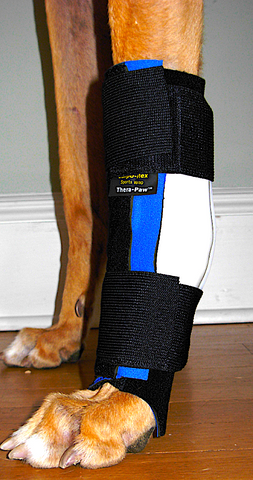 Custom neoprene braces often include foam or sheepskin liners for added comfort and support. The use of soft materials significantly reduces the incidence of pressure sores, and their flexibility make these soft supports the most versatile choice for bracing. For example, a custom neoprene carpal wrap can be splinted over with thermoplastic to yield an immobilizing brace (see image below). The splint/carpal support combination can be used when the dog is engaged in activities that place high stress on the limb/joint. When the dog is more sedentary, the splint can be removed, leaving the animal with a lighter, more comfortable support.