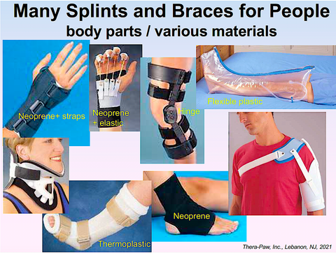 First, let’s take a look at us – humans. There are hundreds of different types of splints and braces made for humans. They come in various ready-made, off-the-shelf sizes (usually from XS to XXL sizes) and are made for practically every part of the body (see image below). These off-the-shelf splints and braces tend to fit most people.