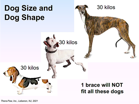 Dogs, on the other hand, are much more difficult to fit with off-the-shelf braces and splints. For off-the-shelf braces to fit most dogs, a bracing company would probably have to make upward of 25 or more different sizes! This is because dogs’ body sizes vary so much. In fact, there is more variability in the dog’s body shape and size than any other mammal on the planet.