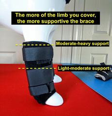 - Support the leg well. In general, a front leg brace should cover between 1/2 to 3/4 of the leg, from floor to elbow (see image right). Covering 1/2 the leg provides light support and covering 3/4 of the leg provides heavier support. Leg braces should sit below the elbow so that the elbow can flex completely without interference.