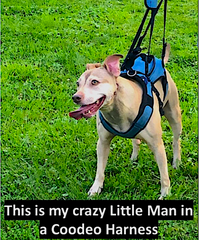 Personal note: The photo above is of my own dog, Asher, a 50-lb pitbull with severe mobility issues (neurological) in his Coodeo Harness. This is his outdoor harness and I use both the leash clip when driving with him and the long, double handles when I’m walking him. The double handles help to balance him evenly – like holding a 50-lb shopping bag :-).