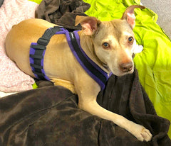 Personal note: Here’s a picture of my dog again, a 50-lb pitbull with significant neurological issues. He needs help standing and walking. Here he is in his EEZWalker Fleece Harness. He wears it comfortably all day without issue and it’s perfect when I need to move him from room to room or to take him out for a short walk or potty break. When I need to walk him outside, I do so using a thick, cotton horse lead rope for better control.