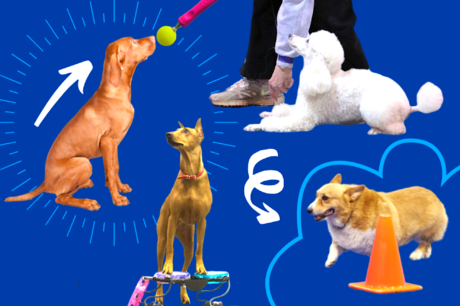 To increase the difficulty, teach your dog to stand on cue, which can be done using the lure-and-reward method. Hold a treat to your sitting dog’s nose, then slowly pull forward to lure your dog into a standing position. Once your dog understands all three positions—sit, stand, and down—you can combine them into a more complex puppy push-up. Or to increase the muscle-building, have your dog go from a stand to a down and then back to a stand again without the sit in the middle.