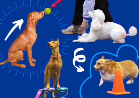 To increase the difficulty, teach your dog to stand on cue, which can be done using the lure-and-reward method. Hold a treat to your sitting dog’s nose, then slowly pull forward to lure your dog into a standing position. Once your dog understands all three positions—sit, stand, and down—you can combine them into a more complex puppy push-up. Or to increase the muscle-building, have your dog go from a stand to a down and then back to a stand again without the sit in the middle.