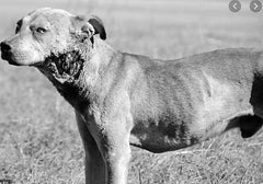 February, 2013 – Moozie, the 2-year old pitbull, was unfazed when he arrived from Georgia to his forever home in New Jersey. He was already a celebrity of sorts when his story made Animal Aid’s Facebook headlines. He was found the previous December roaming Georgia’s back country, starving and with his neck torn open (photo too graphic to post in color).