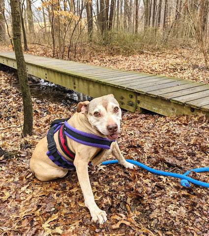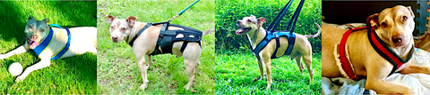 Moozie is 11 years old. This morning, I took him for a 20-minute walk in the park, we played a game of fetch with his favorite yellow softball, and we drove around the countryside for half an hour, really slow and with the windows down so he could sniff. He is outfitted with a modified harness; one that helps me support him as we walk or when he “runs” (hops and sometimes flops) after the ball. The harness is super-soft, lined with sheepskin, and ultra-comfy so that I can leave it on him all day. It has a handle so that we can move him short distances and help him posture when he potties. Below are photos of Moozie with some of the harnesses we tried and modified.