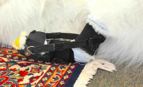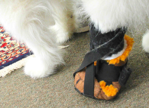 “The Thera-Paw sandal gives him the best support to help him get around easily and he can walk around more”, said Donna. “When he goes outside, he wears a closed boot brace but that is too heavy for him to wear for long periods. So, we rotate between the different braces (the slipper, the sandal, and the closed brace) to help keep him from scuffing up his paws.”