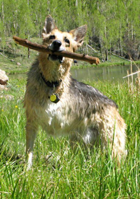 Tripawds dog Eisen after a Williams Creek swim. Photography courtesy Tripawds.com.