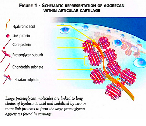 Cartilage contains chondrblasts (cells), collagen (fibres) and proteoglycans (proteins) and is composed in such a way as to hold water. The more water is retained, the better the cushioning and gliding effect of cartilage. Below is a schematic representation of cartilage taken from Encyclopedia of Canine Nutrition Pibot P. Biourge V. and Elliott D. and printed by Royal Canin 2006.