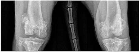 Diagnosis of PL is primarily based on palpation of the affected stifle. Radiography can help determine the presence and degree of limb deformity and aid with planning of any surgical realignment procedures (FIGURES 1 and 2). Radiography can also determine the degree of osteoarthritis if present. On radiography, the patella will be visualized outside of the trochlear sulcus in grade III and IV PL and may be visualized within the trochlear sulcus in grade I and II luxations.4