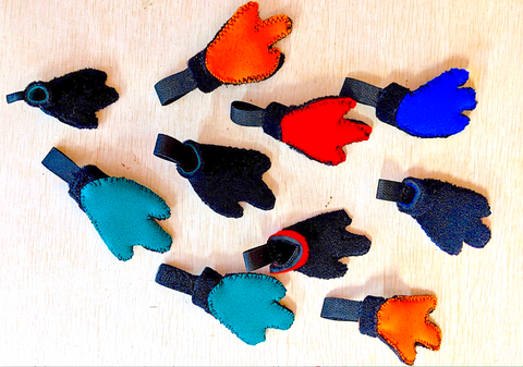 After a bit of pain-staking hand-sewing (the mini-sized booties were too small to be handled by a machine), the results were a colorful assortment of mini-sized bootie keychains (photo below).