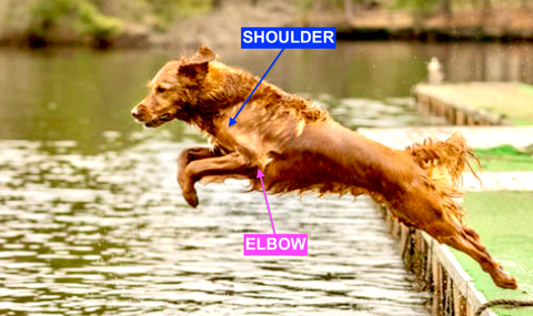 Shoulder joints in humans are easy to find and palpate (feel) since they lie on the outer sides of the body. The shoulder joint of the dog is more elusive; it lies against their front chest and can be hard to feel, especially in dogs with lots of muscle and thick coats. Below is a photo of a dog jumping – note that the shoulder is located next to their chest and is shown with the blue arrow; not to be confused with the dog’s elbow, which is shown with the pink arrow.