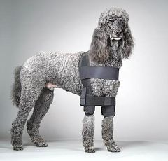 Dog in a shoulder stabilization system (photo courtesy of DogLeggs)