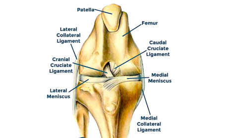 The dog stifle (knee) is anatomically very similar to a human knee. There are two long bones, the femur (thigh bone) and the tibia (shin bone), and a small bone, the patella, which articulate together. There are also four ligaments primarily responsible for the stability of the stifle – the cranial cruciate, caudal cruciate, medial collateral, and lateral collateral. Finally, there are two menisci, medial and lateral, which help act as a cushion between the femur and the tibia and help to provide congruency and further stability to the joint. The dog stifle differs from the human knee in that the top of a dog tibia has a more significant slope (tibial plateau slope or TPS) than that of a human knee.