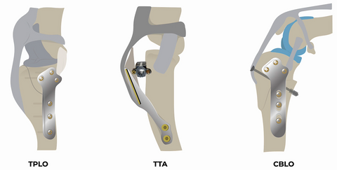 Osteotomy techniques involve changing the anatomy of the knee joint via osteotomy/cutting of the bone. There are a large number of osteotomy procedures performed in veterinary medicine, but the overwhelming theme with all of them is achieving a reduction of the tibial plateau slope (TPS). The average TPS in a dog is approximately 25°. In patients with CCLR, the femur (thigh bone) slides down this slope during weight bearing. The goal with most osteotomy techniques is to reduce this angle to approximately 5°-7°. By changing the TPS, when a dog bears weight the forces acting on the joint are neutralized, and thus the femur no longer slides down the slope of the top of the tibia. Another way of saying this is that the tibia no longer thrusts forward in relation to the femur. In essence, these osteotomy procedures alter the biomechanics of the joint and eliminate the need for the CCL. Osteotomy techniques include the tibial plateau leveling osteotomy (TPLO), CORA based leveling osteotomy (CBLO), triple tibial osteotomy (TTO) and the closing wedge osteotomy. Another osteotomy technique, the tibial tuberosity advancement (TTA) relies on the angle formed between the tibial plateau and the patellar ligament.