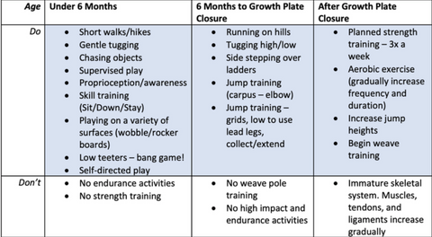 A common denominator used to be that your dog reached physical maturity at one year of age, but that’s simply not accurate! When your dog reaches physical maturity will vary greatly depending on the breed and size of dog. Generally, toy and small breeds will reach physical maturity at a younger age than their large or giant breed counterparts. Knowing your breed and talking with your breeder can help guide you in choosing age appropriate activities for your dog. The growth of a purebred puppy will also differ from the growth of a mixed breed puppy. Depending on the breed and size of the parents a mixed breed puppy may differ in growth stage.  ​