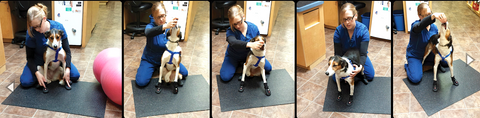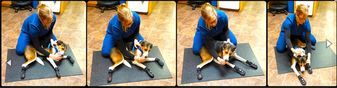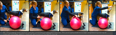 Encouraging correct posture is a key component of all mobilization exercises. FIGURE 1demonstrates correction of hindlimb placement for manual weight-shifting to the hind end. Weight-shifting first to the right side and then to the hind end is accomplished by using a treat. The therapy ball peanut provides the required support for this patient, while the boots and mat improve foot traction.