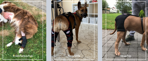 There are several joints that we can support with such a soft orthotics or SOFT braces. In the front legs these are the elbow and wrist joints. In the hind legs, these are the hip, stifle and ankle joints.